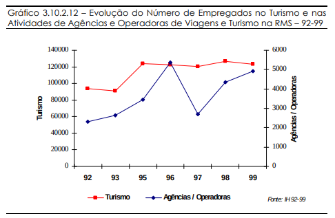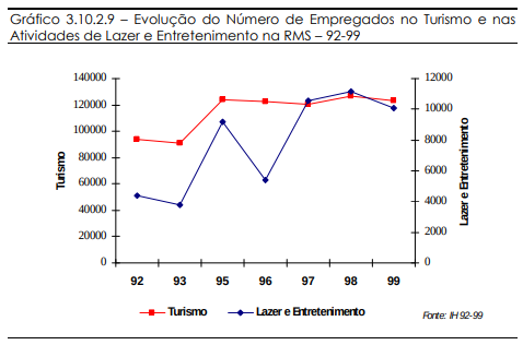Em 99, a situação da oferta de empregos nas atividades de lazer e entretenimento revela tendência a um declínio, enquanto o turismo como um todo se mantém estável. Nota-se, então, que as atividades de lazer têm variações de empregos de maneira independente ao setor como um todo. A razão disso pode ser uma fragilidade em relação a variações do mercado, externas ao setor. Sob uma outra interpretação, pode-se dizer que o ramo de lazer ainda não tem maturidade, estando em desenvolvimento, e por isso apresenta tamanhas variações.