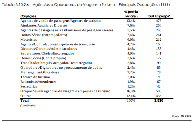 As ocupações mais significativas nesse ramo são em primeiro lugar os Agentes de venda de passagens/Agente de Turismo, que possuem 13,4% dos empregos distribuídos no setor. Em seguida, aparecem os Ajudantes/Auxiliares Diversos, Agentes de Passagens Aéreas/Emissores de Passagens Aéreas, Donos e Sócios (empregadores) que representam em torno de 7,5% dos empregados, representatividade muito menor.