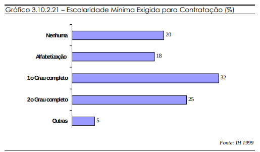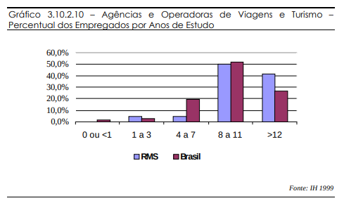 Além dos cursos específicos para o setor turístico, a maioria das empresas (mais de 35%) requer uma escolaridade mínima até o primeiro grau. Cerca de 25% das empresas exigem no mínimo segundo grau completo.