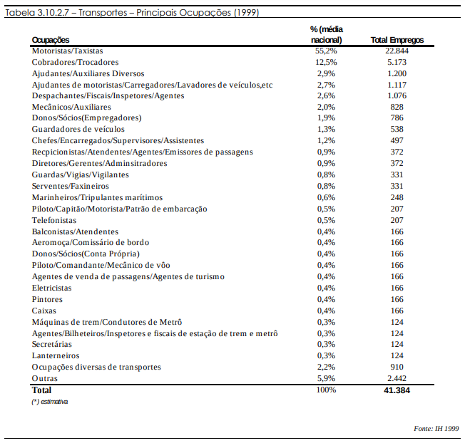 As funções que possuem maior representatividade são as de motorista e taxista. Estes empregados representam mais da metade das ocupações, 55,2%. Com uma porcentagem muito menor aparecem os cobradores/trocadores, com 12,5%.