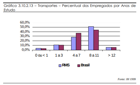 A comparação dos índices da RMS com as médias nacionais nos mostra que os empregados da RMS são mais bem capacitados, contando, porém com um nível menor de remuneração. Isto é, a RMS se constitui num mercado de empregos muito concorrido e competitivo. É o que podemos identificar como tendência no Gráfico 3.10.2.3.