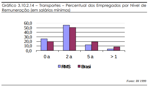 A parcela de trabalhadores que recebem entre 2 e 5 salários mínimos é de 55,25%. Apenas 3,6% recebem mais de 10 salários mínimos na RMS, quando no Brasil 8,10% dos trabalhadores do setor de transporte recebem mais que 10 salários mínimos.