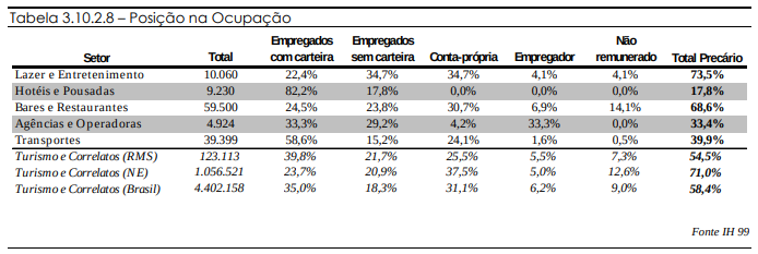 Hotéis e Pousadas é o setor onde a relação de ocupações precárias é menor. Em Agências e Operadoras, é alto o percentual de empregadores e baixo o nível de ocupações precárias. Em Transportes, por sua vez, também é alto o contingente de trabalhadores formais e autônomos (representados por taxistas, principalmente). Em Bares e Restaurantes é alto o índice de proprietários e sócios que trabalham por conta própria. Em Lazer e Entretenimento é alto o número de músicos e atores, que tipicamente não apresentam relação de vínculo formal com o local onde exercem a ocupação.