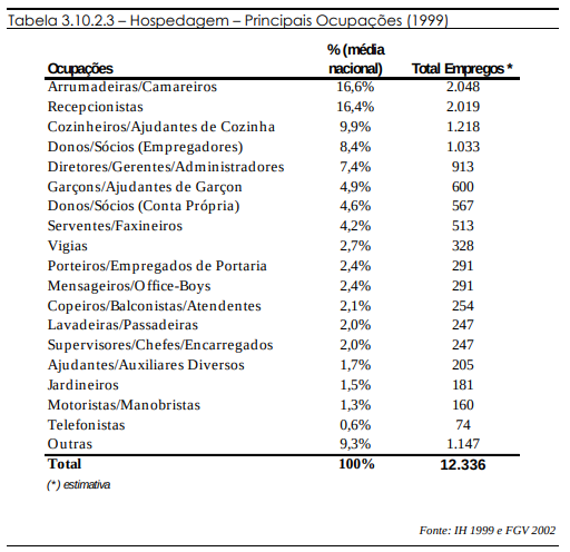 No que diz respeito ao número de pessoas ocupadas, os destaques da área de hospedagem, são os cargos de recepcionista, arrumadeira e camareira. É também bem representativa a fatia de empregos ocupada pelos donos dos empreendimentos . Somando as duas categorias (de donos empregadores e donos que tomam conta de seus estabelecimentos), tem-se uma representatividade de 13%, equiparável aos cerca de 16% das ocupações mais representativas.