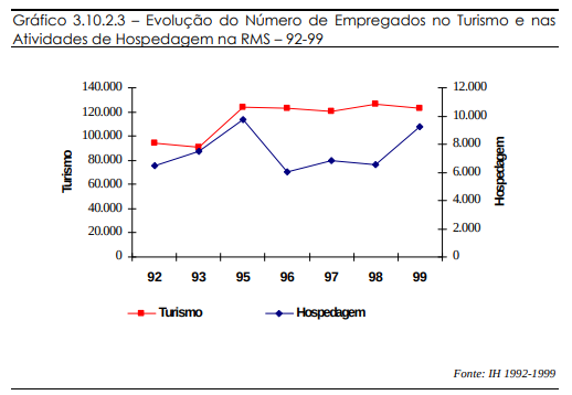 No período de 98-99, a hotelaria teve uma explosão na geração de empregos na RMS (aumento de 41%), apesar de a atividade turística como um todo não demonstrar tal crescimento.