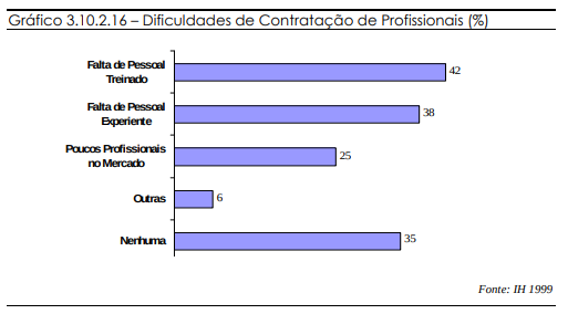 Segundo a pesquisa do IH, dois terços das empresas encontram dificuldades para a contratação de pessoal. Dentre as dificuldades, as empresas apontam com destaque a falta de treinamento e falta de experiência.