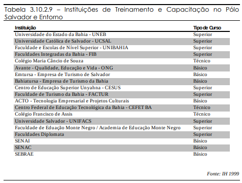 A Tabela 3.10.2.9 resume as instituições que prestam cursos na área de turismo e hotelaria do Pólo Salvador e Entorno.