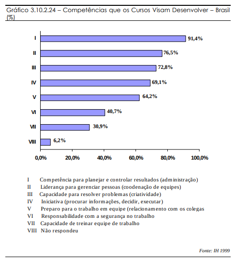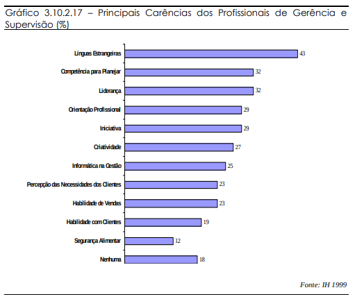 As carências dos profissionais, segundo os empregadores, (Gráfico 3.10.2.17 e Gráfico 3.10.2.18) aproximam-se pouco das competências que os cursos disponíveis visam desenvolver. Esses cursos são mais voltados aos níveis gerenciais e de controle.