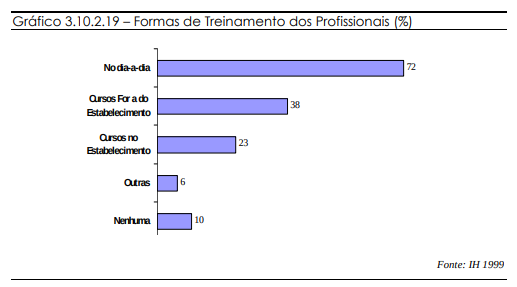 Com isso, mais uma vez se conclui que são necessários mais cursos de treinamento e capacitação. Na intenção de amenizar estas carências, as empresas oferecem aos seus funcionários algum tipo de treinamento. A maioria delas oferece o treinamento na execução diária das tarefas (72%). Em 38% das empresas, ocorre treinamento fora do estabelecimento, sendo maior a ocorrência nas agências de viagem.