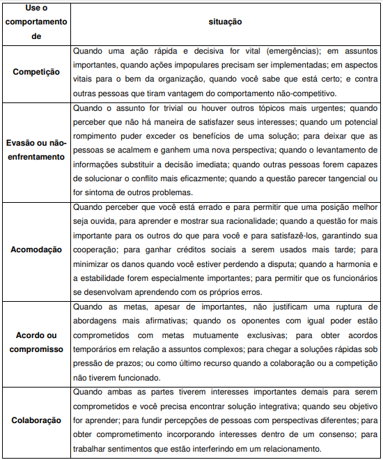 As orientações abaixo não devem ser tomadas como absolutas, ou seja, como vimos anteriormente, as condições que levam a um determinado tipo de comportamento numa situação de conflito variam bastante conforme o caso. Assim, não se trata de uma prescrição rígida que deva ser seguida literalmente. Ao contrário, as orientações referem-se a situações ideais ou típicas teoricamente falando, mas que podem servir como balizamento para uma decisão.