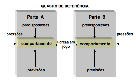 - Quadro de referência: diz respeito à cultura organizacional, ou seja, o conjunto de valores, pressupostos, regras, normas, ritos e outros elementos normativos que exercem uma coerção e influência sobre as partes e que contribuem decisivamente para o comportamento.