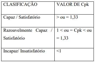 O Cp é considerado um índice de capacidade potencial, pois quando um processo de arrumação ou check out é potencialmente capaz de atender ao cliente, porém, devido ao deslocamento do valor médio isso não acontecer. Cpk é o índice que leva em conta a dispersão e a centralização do processo em relação aos limites de especificação. É denominado índice de capacidade real, a fim de levar em conta esse possível deslocamento do valor médio. Assim, com a aplicação do Cpk podemos classificar o processo quanto a sua capabilidade, conforme a tabela 1ª seguir: