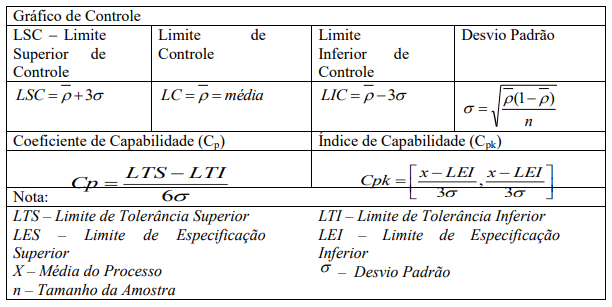 O controle de processo é realizado pela medição através de gráficos de controle que têm como objetivo principal a verificação se o mesmo está estatisticamente estável, permitindo o aprimoramento contínuo, mediante a redução de sua variabilidade. As principais variáveis utilizadas para o controle estatístico de processos são mostradas na tabela 2 a seguir.