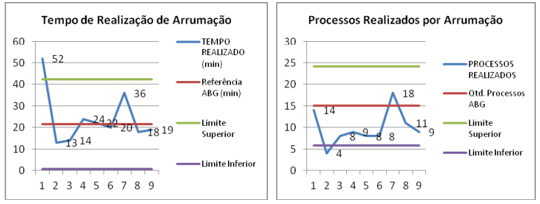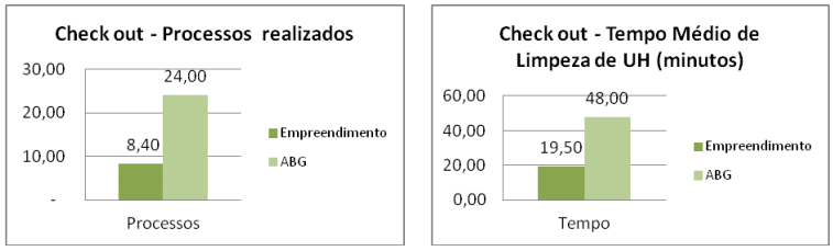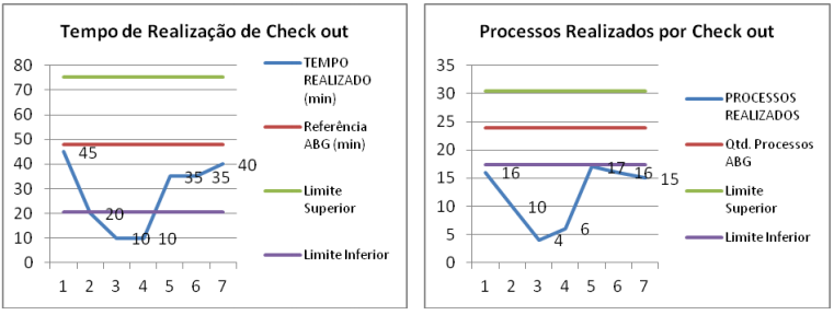 O processo foi avaliado através de gráficos de controle para identificar os desvios padrões para as variáveis de tempo de execução e processos executados, tanto para check outs como para arrumações, como é mostrado a seguir:
