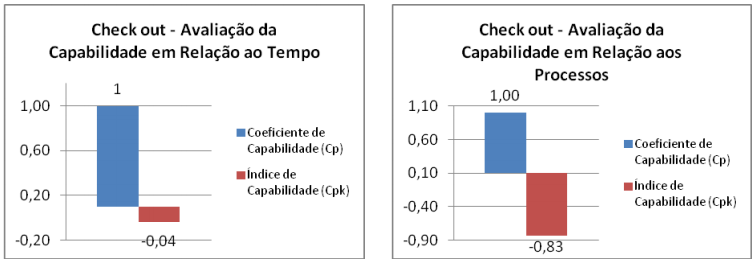 - O processo de avaliação do tempo de realização de check out está fora de controle, pois apresenta um coeficiente de capabilidade (Cp) igual a 1, porém o índice de capabilidade (Cpk) menor que 1, isto significa que o processo tende a sair de controle.