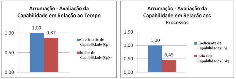 - O processo de avaliação dos processos realizados de arrumação mostra-se incapaz, pois seu índice de capabilidade (Cpk) com valor de 0,45 é incapaz.