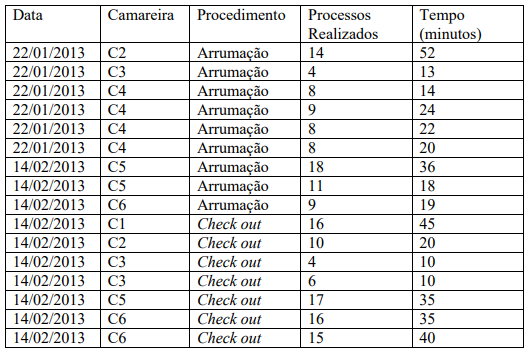 - O processo de avaliação do tempo de realização de arrumação está fora de controle, pois apresenta um coeficiente de capabilidade (Cp) igual a 1, porém o índice de capabilidade (Cpk) igual a 0,87, isto significa que o processo é incapaz.