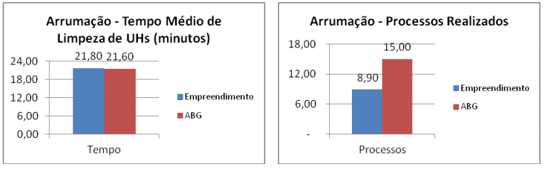 A análise recai sobre dois aspectos: a qualidade dos processos que devem ser executados corretamente para garantir a limpeza e higienização das UHs e o tempo médio aceitável para a limpeza das UHs. A base metodológica que nos basearemos é a da ABG – Associação Brasileira de Governantas e Profissionais da Hotelaria que estipula que para uma UH de cerca de 25m² realizando 24 processos operacionais de limpeza, higienização e arrumação são necessários em média 31 minutos.