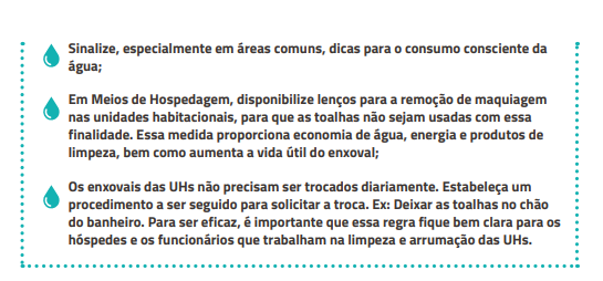Para desenvolver a atividade de forma sustentável, deve-se buscar a economia de recursos, desde que este esforço não implique em prejuízos à qualidade e segurança dos serviços, à produtividade da equipe e ao conforto do consumidor, bem como não resulte na redução de postos de trabalho, e sim, na maior capacitação e contratação de trabalhadores da região.