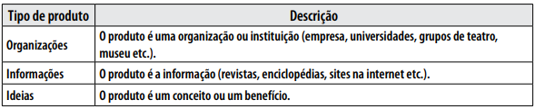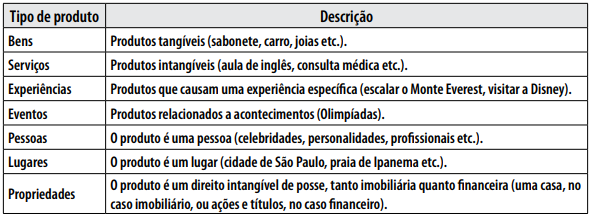 Outro conceito importante, implícito na definição de marketing, é o produto: é “a oferta capaz de satisfazer uma necessidade ou desejo, por meio de uma troca”3 . No entanto, o produto não se refere apenas a bens tangíveis, como uma caneta, um livro ou um computador. Existem dez tipos de produtos, conforme listados na tabela 1.1.