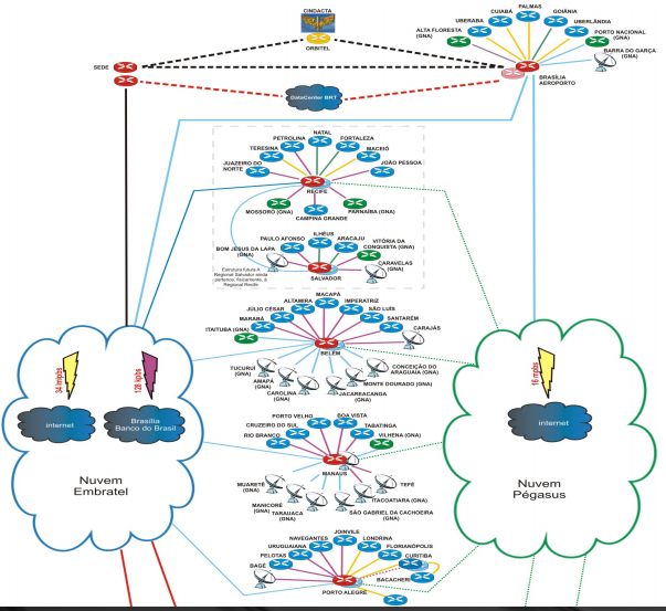Em todo processo de automação baseado em TI é mandatório o uso de uma infra-estrutura de comunicações que suporte o tráfego de informações com segurança, rapidez e precisão no tempo de resposta, além da pronta disponibilidade das informações. Foi observado que, em função da complexidade da estrutura da INFRAERO e a abrangência da empresa em todo território nacional, o quesito segurança fora atentamente analisado, optando-se à época da implantação sistêmica da INFRANET por contratar empresas diferentes no mercado, oferecendo duas redes funcionando paralelamente. A Rede Principal é representada na Figura 2 pela nuvem EMBRATEL e a Rede Secundária ou Redundante, representada pela nuvem Pegasus. No que diz respeito ao serviço de internet utilizado, a infra-estrutura inclui dois acessos, um pela Embratel e outro pela Pegasus. A Figura 3 ilustra o Diagrama Geral da Rede Principal representado pela tipologia de rede adotada pela INFRAERO, hierarquizada em três níveis: Sede (Core), Regionais e Aeroportos vinculados.