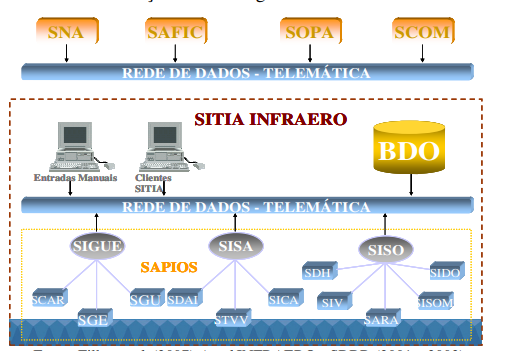 O padrão de automação aeroportuária adotado pela INFRAERO, sintetizado e ilustrado na Figura 4, demonstra os sistemas de automação de um sítio aeroportuário projetados com uma concepção integrada, formando um sistema maior chamado SITIA. No padrão SITIA todos os sistemas, subsistemas e módulos específicos são integrados fisicamente por meio de uma rede de dados (telemática) padrão TCP/IP, que atende todo o sítio aeroportuário. A funcionalidade de cada um dos componentes sistêmicos do SITIA é descrita detalhadamente no Edital de Aquisição da Solução, anexo VII ao Memorial Descritivo do SITIA.
