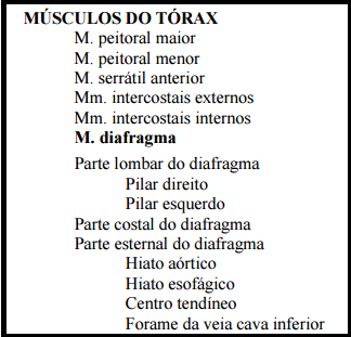 Além do esqueleto, o tórax possui uma musculatura denominada músculos intercostais (entre as costelas) que, com o diafragma (músculo que separa o tórax do abdômen), é responsável pelos movimentos respiratórios de inspiração (entrada do ar) e expiração (saída do ar). Para que o ar entre, o diafragma e os músculos intercostais se contraem, expandindo o tórax; e, para que o ar saia, eles relaxam e o tórax volta ao seu tamanho normal. O tórax também possui os músculos peitorais, que auxiliam a movimentação dos ombros e dos braços.