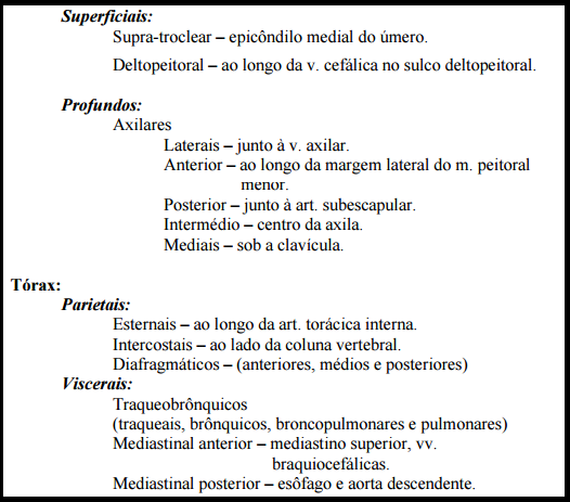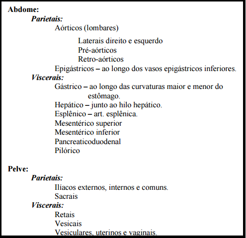 São estruturas pequenas com a forma e o tamanho de feijão, interpostos no trajeto dos vasos linfáticos, dispostos em grupos de número variável, porém de localização e distribuição constante pelo corpo.