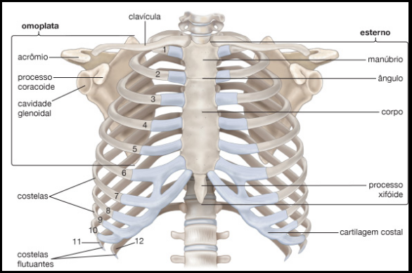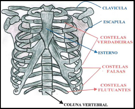 Os ossos que constituem a caixa torácica são o esterno, situado no meio do peito, as costelas e as vértebras torácicas da coluna vertebral. As costelas são em número de doze pares, que se ligam às doze vértebras torácicas e ao esterno, com exceção dos últimos dois pares, que se unem somente às vértebras, sendo chamadas de costelas flutuantes.