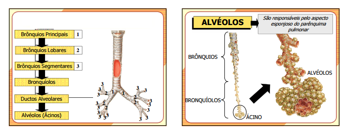 Os órgãos do sistema respiratório dos vertebrados terrestres, além de dois pulmões, são: fossas nasais, boca, faringe (nasofaringe), laringe, traqueia, brônquios (e suas subdivisões), bronquíolos (e suas subdivisões) e os alvéolos pulmonares reunidos em sacos alveolares.