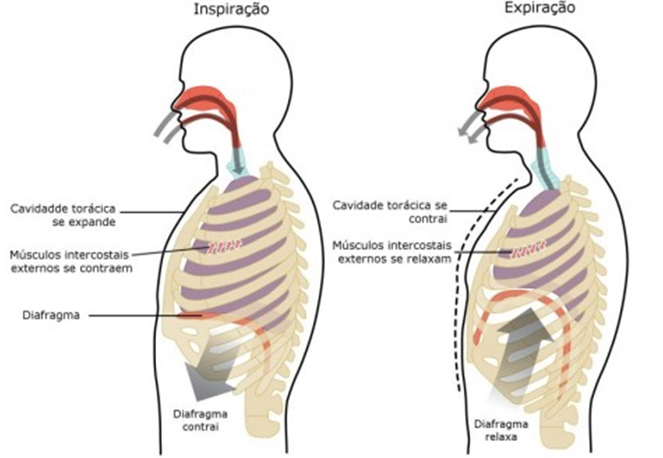Para que ocorra o processo de respiração, é necessária uma ação conjunta de músculos intercostais e do diafragma, que permitem a entrada e a saída do ar. O ato de respirar pode ser dividido em dois movimentos básicos: inspiração e expiração.