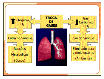 O ar inspirado, rico em oxigênio, passa pelas vias respiratórias, sendo filtrado, umedecido, aquecido e levado aos pulmões. No íntimo pulmonar o oxigênio do ar inspirado entra na circulação sanguínea e o dióxido de carbono do sangue venoso é liberado nos alvéolos para que seja eliminado com o ar expirado. O ar expirado é pobre em oxigênio, rico em dióxido de carbono e segue caminho oposto pelo trato respiratório.