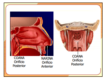 A parte superior da faringe se comunica com as cavidades do nariz, através das coanas, e com as orelhas médias, pela tuba auditiva de cada lado.