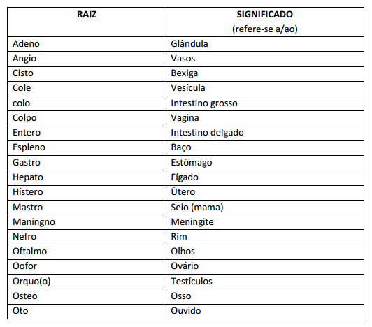 Raiz: parte da estrutura da palavra, indicando q parte anatômica que sofrerá a intervenção cirúrgica.