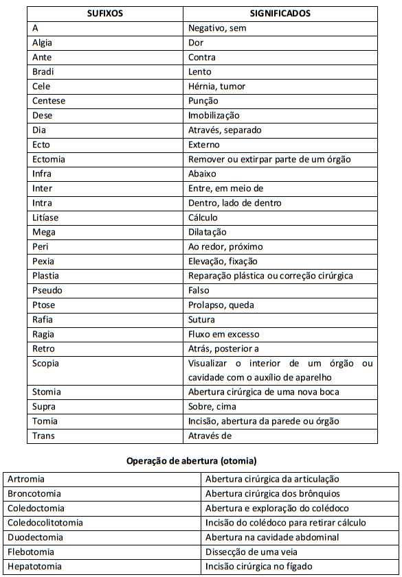 Afixos: partes que são acrescidas antes (prefixos) ou após a raiz (sufixos). O sufixo indica o tratamento cirúrgico ou diagnóstico.