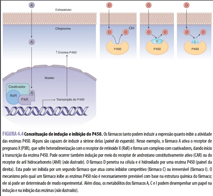 O uso do fenobarbital para evitar icterícia neonatal demonstra que o metabolismo dos fármacos pode ser influenciado pelos níveis de expressão das enzimas metabolizadoras. Embora algumas enzimas P450 sejam constitutivamente ativas, outras podem ser induzidas ou inibidas por diferentes compostos. A indução ou a inibição podem ser incidentais (efeito adverso de um fármaco) ou deliberadas (efeito desejado da terapia). O mecanismo primário da indução da enzima P450 é o aumento da expressão da enzima principalmente por transcrição aumentada, embora possa haver menor participação de aumento da translação e redução da degradação. A indução das enzimas P450 por uma gama de fármacos reflete a biologia dos receptores xenobióticos que atuam como sistema de vigilância do corpo para metabolizar compostos potencialmente tóxicos. Fármacos, poluentes ambientais, compostos químicos industriais e até mesmo alimentos podem penetrar nos hepatócitos e ligar-se a vários receptores xenobióticos diferentes, como receptor de pregnano X (PXR), receptor de androstano constitutivamente ativo (CAR) e receptor de aril-hidrocarboneto (AhR) (Figura 4.4). Essas moléculas são receptores nucleares de hormônios. Quando um composto xenobiótico liga-se ao receptor e ativa-o, o complexo é translocado para o núcleo e, aí, liga-se aos promotores de várias enzimas de biotransformação, acarretando aumento da expressão das enzimas P450. Por um mecanismo semelhante, a ativação do receptor nuclear de hormônio também pode aumentar a expressão dos transportadores de fármacos que ajudam na depuração dos compostos do corpo, como MDR1 e OATP1
