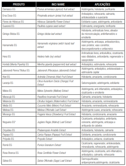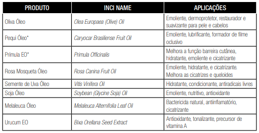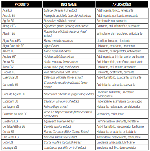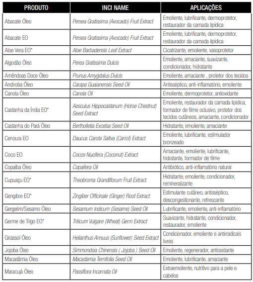 É importante diferenciar os produtos cosméticos naturais dos orgânicos: produtos orgânicos possuem certificação diferencial conferida por órgão competente (como o EcoCERT), e a formulação não leva itens sintéticos como silicones, fragrâncias, polietilenoglicol (PEG), corantes, derivados do petróleo nem produtos de origem animal. Todos os componentes da fórmula são exclusivamente naturais e seguem rígidos padrões de produção (sem agrotóxicos, fabricado em indústrias de padrão trabalhista ouro etc.). A lista abaixo será de grande valia para a prescrição das fórmulas. A nomenclatura INCI NAME (International Nomenclature Cosmetic Ingredient) refere-se ao nome químico do produto, que pode ter diversos nomes comerciais conforme escolher o fabricante. O que pode diferenciar dois extratos da mesma substância é a via de produção.