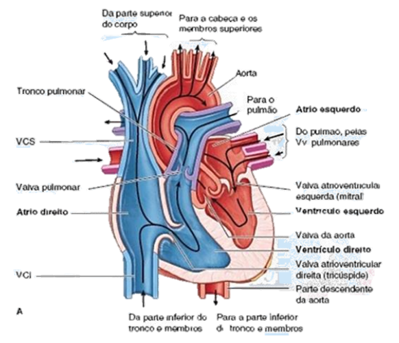 O coração é uma bomba dupla, auto ajustável, de sucção e pressão, cujas partes trabalham em conjunto para levar sangue a todas as partes do corpo. O lado direito do coração recebe sangue pobre em oxigênio (por meio das Veias Cavas Superior e Inferior), pois é o sangue que já circulou por todo o corpo. Já o lado esquerdo, recebe sangue rico em oxigênio (por meio das veias pulmonares), pois este sangue acaba de ser oxigenado nos pulmões, e o bombeia para a aorta.