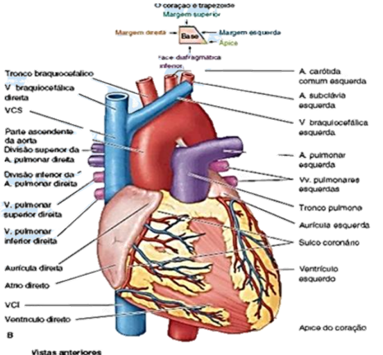 Margem Superior: É formada pelos átrios e pelas aurículas D e E em vista anterior. Essa margem é muito importante, pois dela emergem a parte ascendente da aorta e o tronco pulmonar. Além disso a Veia Cava superior desemboca no seu lado direito.