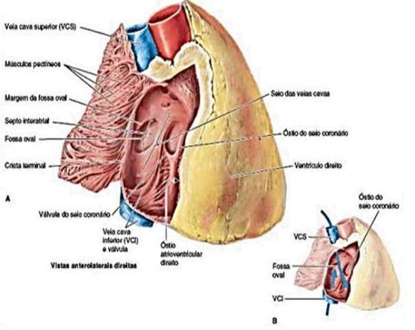 Interior: Sua parte Posterior é lisa, de paredes finas, onde se abrem as veias cavas e o seio coronário. Já a parte anterior é muscular, rugosa, formada pelos músculos pectíneos. Está presente o Óstio Atrioventricular Direito, por meio do qual o átrio direito transfere sangue pouco oxigenado para o ventrículo direito.