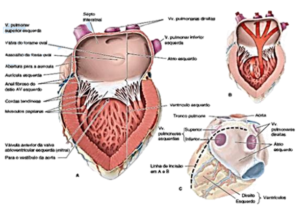 Átrio direito: Forma a margem direita do coração. Essa é a câmara que recebe sangue venoso da Veias Cavas (superior e inferior) e do Seio Coronário. Projeta-se formando uma bolsa muscular cônica, chamada de aurícula direita, a qual aumenta a capacidade do átrio, funcionando como uma câmara adicional.