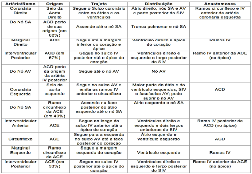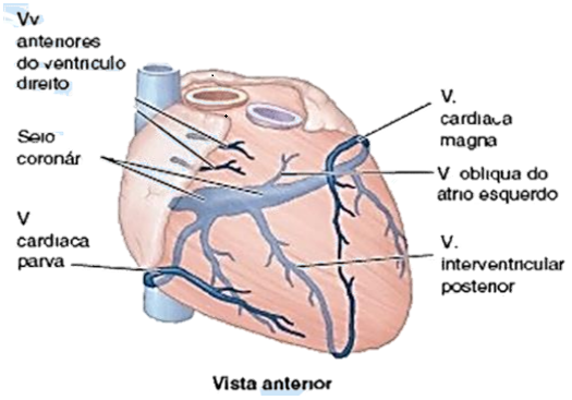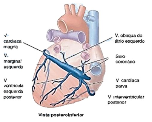 Seio Coronário: É a principal veia do coração. É um canal venoso largo que segue da direita para a esquerda na parte posterior do sulco coronário e recebe as veias: Cardíaca Magna (extremidade esquerda), Veia Interventricular Posterior e Veia Cardíaca Parva (extremidade direita), Veia Posterior do Ventrículo Esquerdo e Veia Marginal Esquerda.