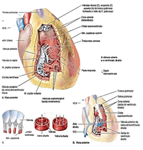 No seu interior, apresentam-se os músculos papilares, que são projeções musculares cônicas, com bases fixadas à parede ventricular. Deles originam-se as cordas tendíneas, que fixam-se às margens livres e às superfícies ventriculares das válvulas anterior, posterior e septal, de maneira a evitar a separação das válvulas e sua inversão. Dessa forma, as válvulas impedem a regurgitação de sangue do Ventrículo Direito para o átrio direito durante a sístole ventricular.