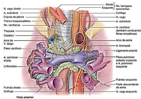 Mediastino: O mediastino é a cavidade torácica onde estão inseridas diversas estruturas, como os grandes vasos e o coração. Ele se divide em mediastino superior e inferior, estando o coração na parte média do mediastino inferior o qual possui as partes anterior e posterior.