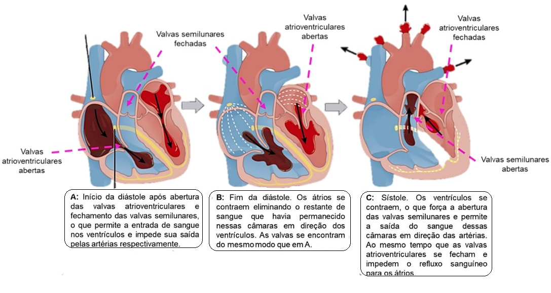 Tudo se inicia com um breve instante em que ambas as câmaras, átrios e ventrículos, estão relaxados. Os átrios, por sua vez, estão recebendo o sangue vindo das veias cavas enquanto os ventrículos acabaram de completar uma contração.
