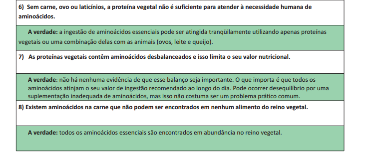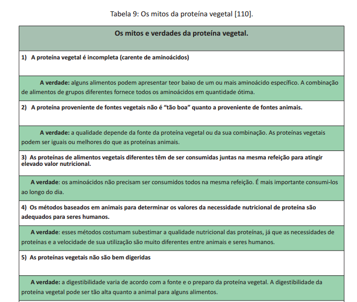 Os estudos de avaliação de necessidades proteicas não confirmam a recomendação de ingestão diferente de proteínas entre vegetarianos e não vegetarianos . Segundo uma metanálise, no organismo humano a incorporação da proteína vegetal não é diferente da animal . Frente aos frequentes equívocos de conceitos sobre a proteína animal, chamamos a atenção do profissional nutricionista para que se mantenha atualizado a respeito dos 8 mitos da proteína vegetal (Tabela 9):