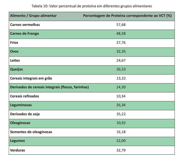 Uma forma de avaliar a segurança da dieta vegetariana em termos do teor de proteínas dos alimentos vegetais é comparar o valor calórico das proteínas em relação ao valor calórico total do alimento. Por exemplo, 100 gramas de aveia crua contêm 17 gramas de proteína, ou seja, em 395 kcal (100 g de aveia) há 68 kcal de proteína (17 g x 4 kcal). Isso corresponde a 17% do valor calórico total. Assim, se ingerir somente aveia durante o dia inteiro até atingir a recomendação energética, o indivíduo terá ingerido 17% do VCT como proteína, o que o deixa bem acima da necessidade proteica (10% do VCT). Veja a Tabela 10, que apresenta o cálculo relativo aos diversos grupos alimentares :