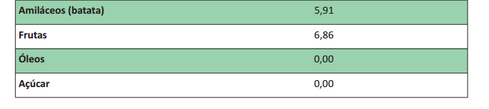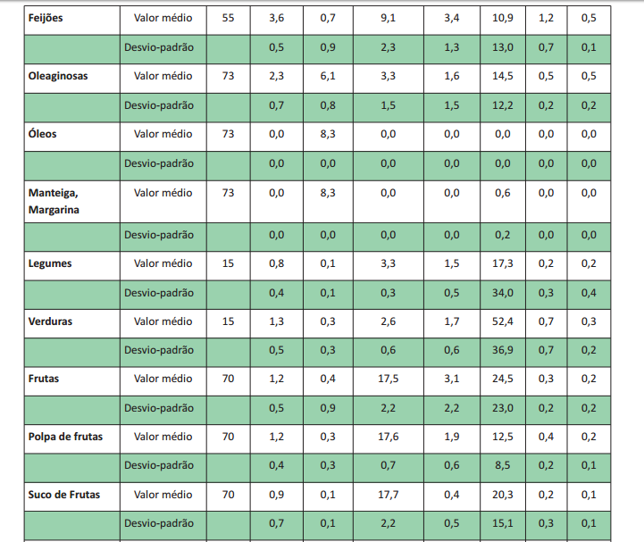 A Tabela 24 foi elaborada para facilitar o raciocínio clínico rápido frente aos grupos alimentares. Os dados foram retirados da Tabela Taco, 3ª edição e, quando ausentes, complementados com a Tabela do Departamento de Agricultura dos Estados Unidos. Para a elaboração dos valores médios de nutrientes, quando o alimento, na tabela Taco, continha valores traço (tr) ou dados com valores não aplicáveis (NA), o valor do nutriente foi considerado zero. Os grupos alimentares com desvio-padrão menor têm dados mais precisos. Havendo desvio-padrão mais alto, recomenda-se o cálculo com o alimento individualizado.