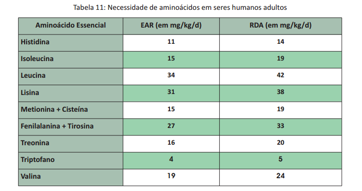 Avaliando a tabela acima, fica fácil entender porque é muito difícil cumprir a recomendação diária de energia sem atender às recomendações proteicas. Em estado natural, apenas amiláceos e frutas não atingem 10% do valor energético como proteína. Os dois alimentos modificados pelo ser humano (óleos e açúcar) não têm proteína na composição. Com relação aos aminoácidos, a metionina não é aminoácido limitante para a síntese de proteínas . O único aminoácido que exige atenção em alguns casos é a lisina, por ser o aminoácido encontrado em menor teor nos cereais, que costumam ser à base da dieta da maioria da população mundial. No entanto, mesmo em dietas baseadas em cereais, a lisina não constitui limitação para a síntese proteica. A necessidade de aminoácidos em seres humanos é vista na Tabela 11: