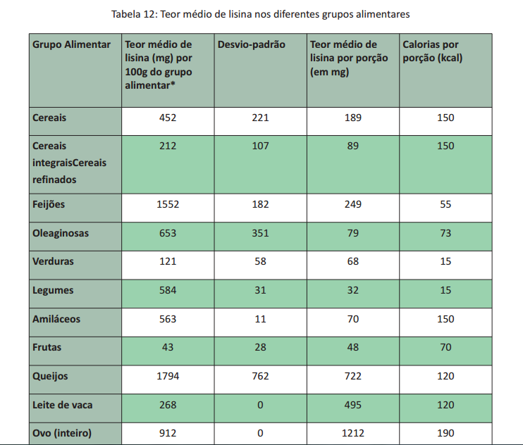 A Tabela 12 demonstra o teor médio de lisina encontrado nos grupos alimentares: